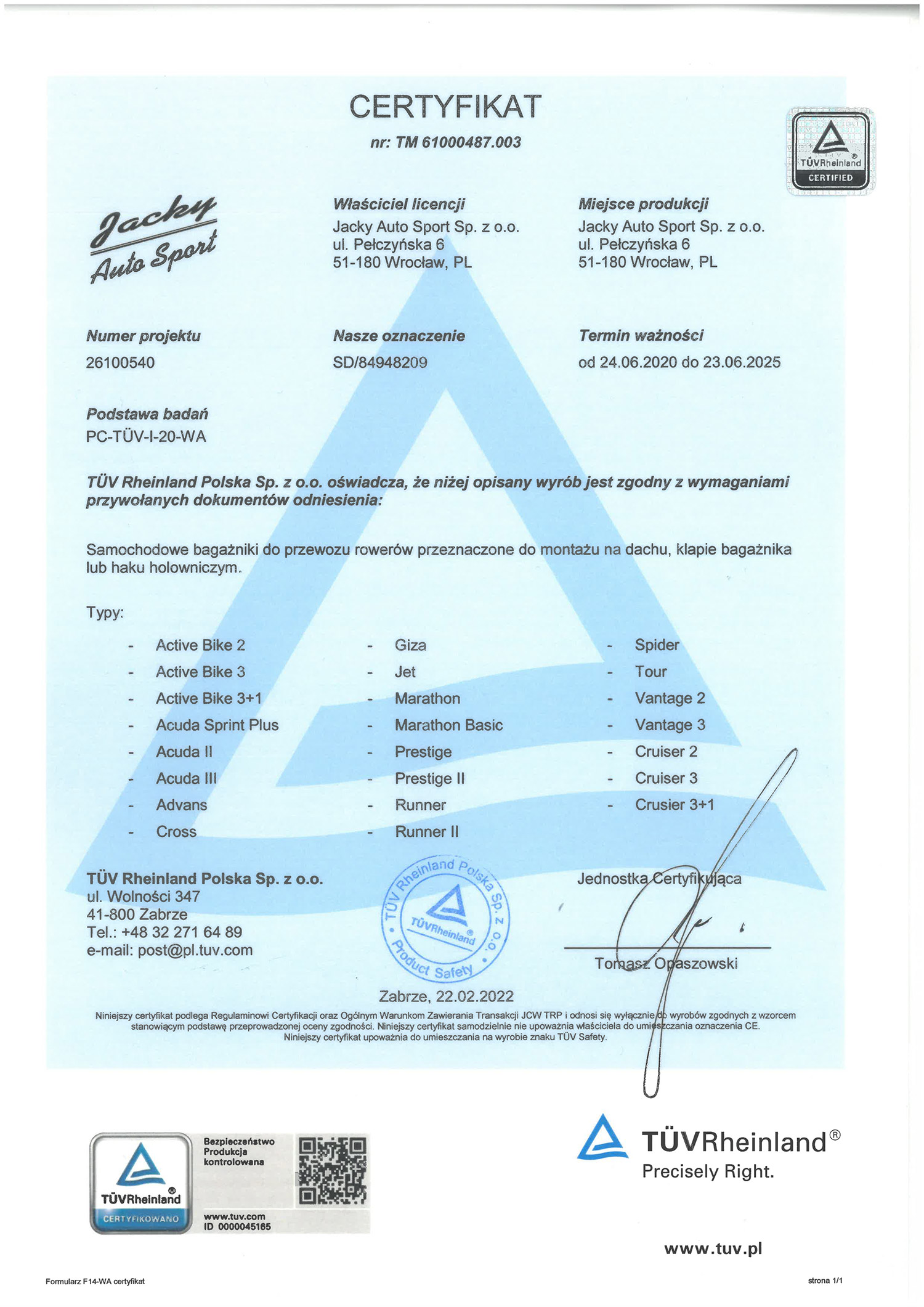 Uchwyt posiada certyfikat TÜV Rheinland, co świadczy o spełnianiu przez bagażnik rygorystycznych norm bezpieczeństwa, jakości i użyteczności. Wydawany przez niezależny od producentów organ jest gwarancją rzetelnej, wiarygodnej i profesjonalnej oceny produktów.