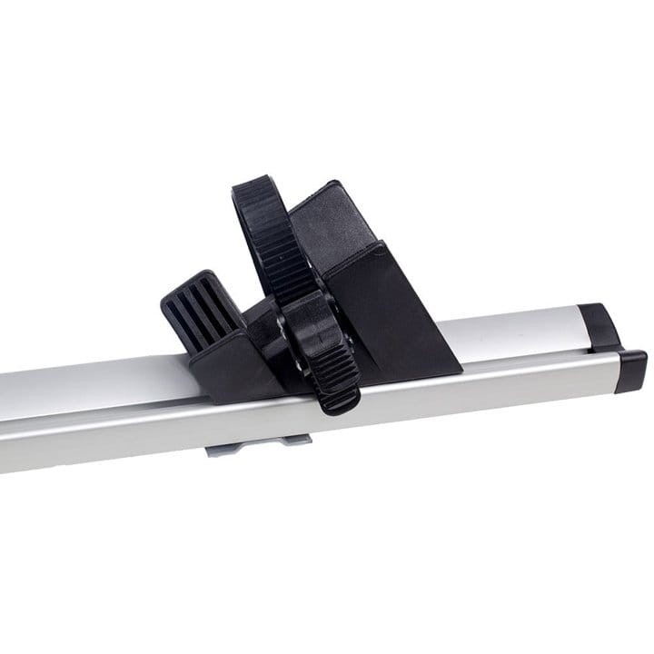 Uchwyt posiada aluminiowy profil, na którym znajdują się regulowane podstawki pod koło. Trwale przytwierdzony pasek usprawnia mocowanie ramy, a klamra na zamek zapewnia komfortowe i bezpieczne zaciągnięcie paska.