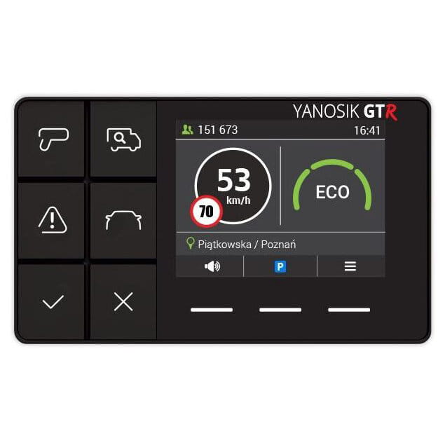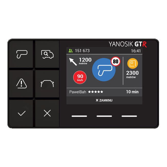 Yanosik GTR wyposażony jest w 2,4'', czytelny, wyświetlacz. Pokazywane są na nim m. in. zgłoszenia w formie graficznej, prędkość z jaką jedzie kierowca, liczba użytkowników online. Yanosik GTR posiada podświetlaną, wygodną w użytkowaniu silikonową klawiaturę z przyciskami do zgłaszania następujących zdarzeń drogowych: kontrola prędkości, kontrola ITD, patrolu nieoznakowanego z wyborem marki pojazdu oraz zagrożeń (wypadek, prace drogowe, zatrzymany pojazd).