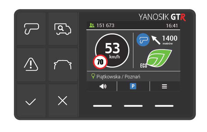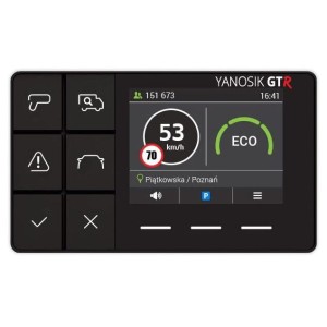 Urządzenie podłączone do źródła zasilania uruchamia się samoczynnie po wykryciu ruchu pojazdu. W czasie postoju dłuższego niż minutę Yanosik GTR pokaże nam statystyki dotyczące przebytej trasy. Do potwierdzania i odwoływania zdarzeń drogowych służą 2 dedykowane przyciski znajdujące się w dolnej części klawiatury. Pod wyświetlaczem znajdują się również 3 przyciski funkcyjne umożliwiające m.in. dostosowanie jasności ekranu oraz głośności komunikatów.