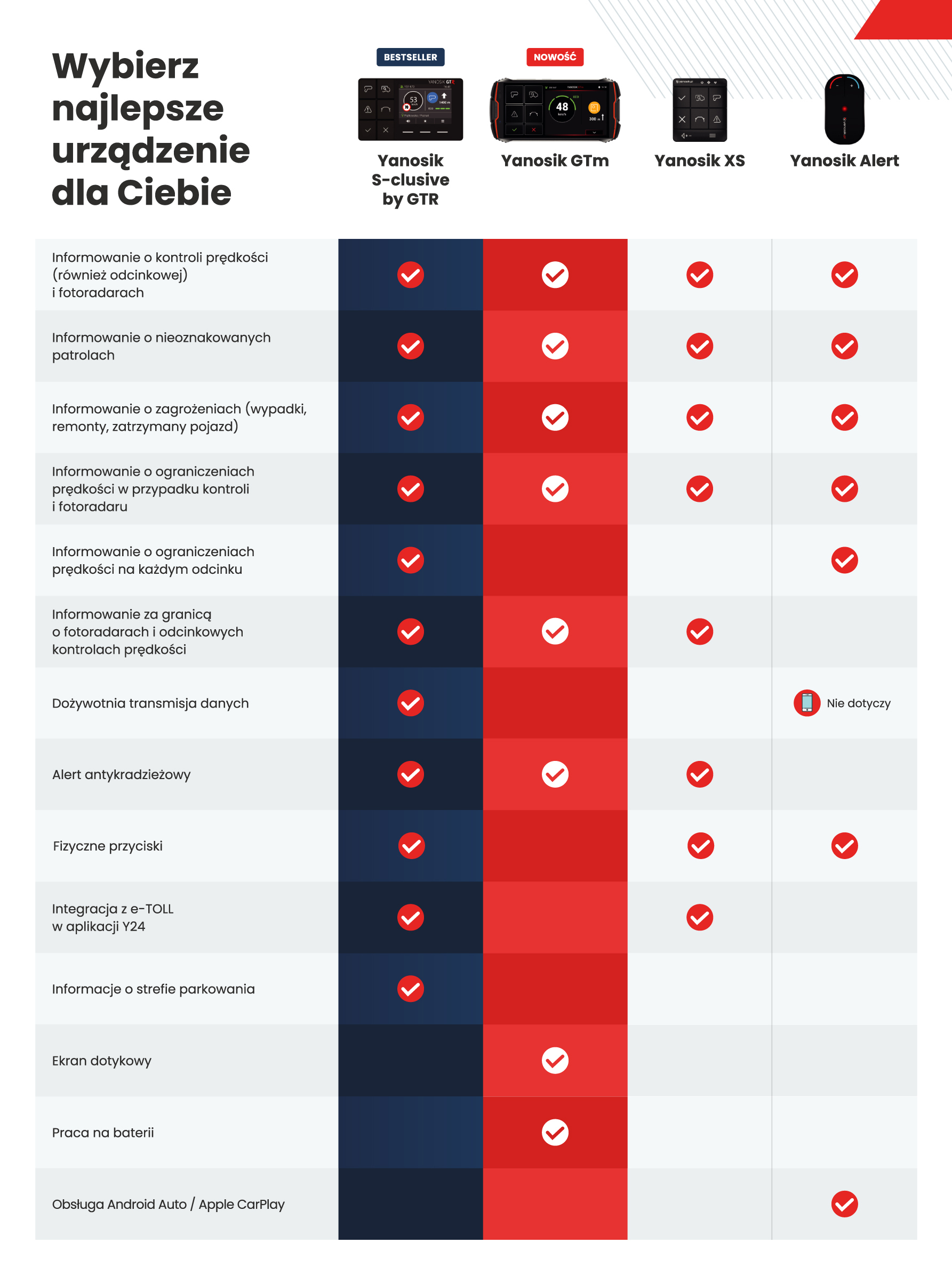 Poniżej prezentujemy porównanie wszystkich urządzeń Yanosik w formie tabeli tak, abyś łatwiej dokonał wyboru, który z nich będzie dla Ciebie odpowiedni. Kliknij tutaj, aby zobaczyć większą wersję tabeli.