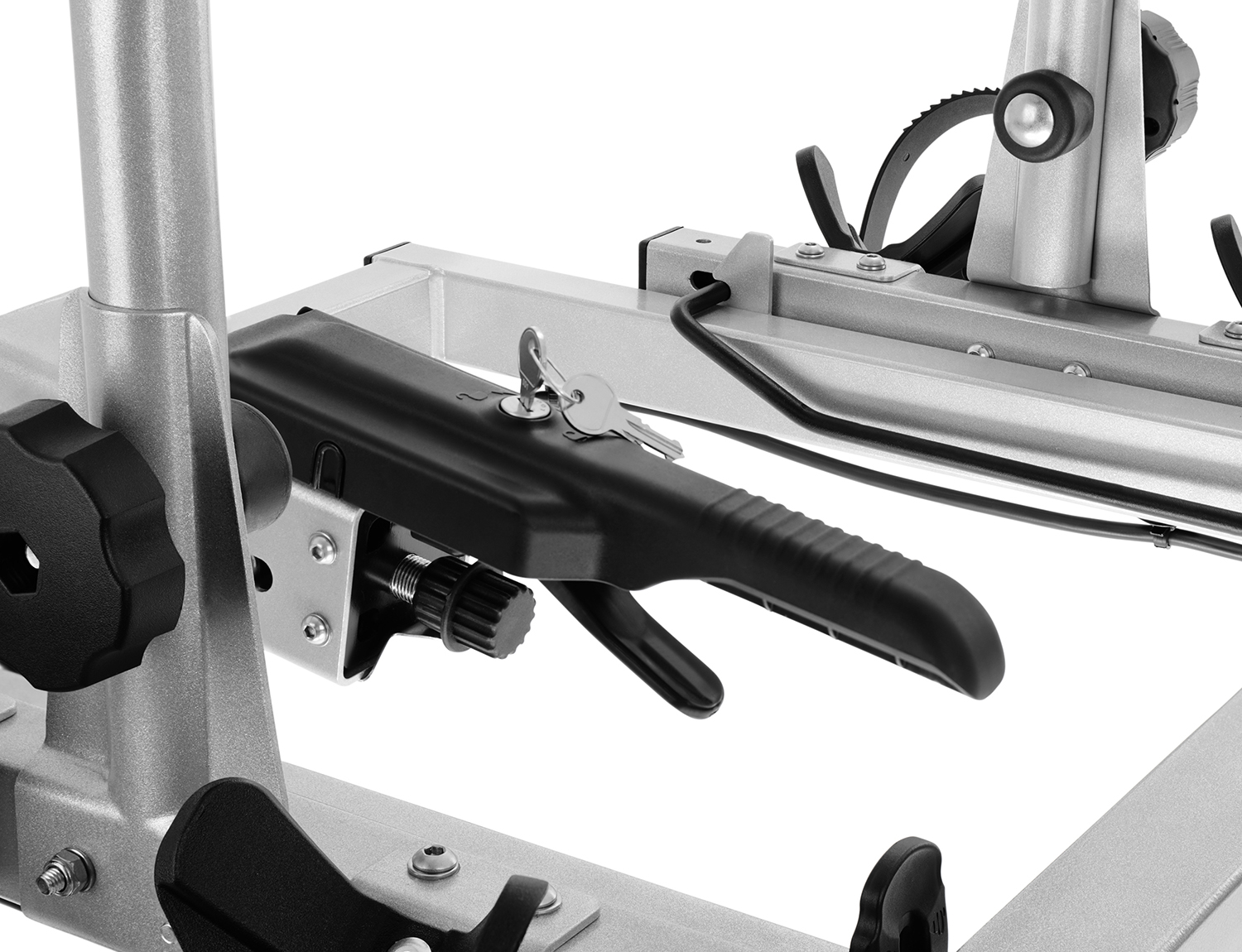 Bagażnik w miejscu montażu na haku posiada indywidualny zamek zamykany na kluczyk zabezpieczający platformę podczas transportu oraz dostarczający ochronę przed kradzieżą.