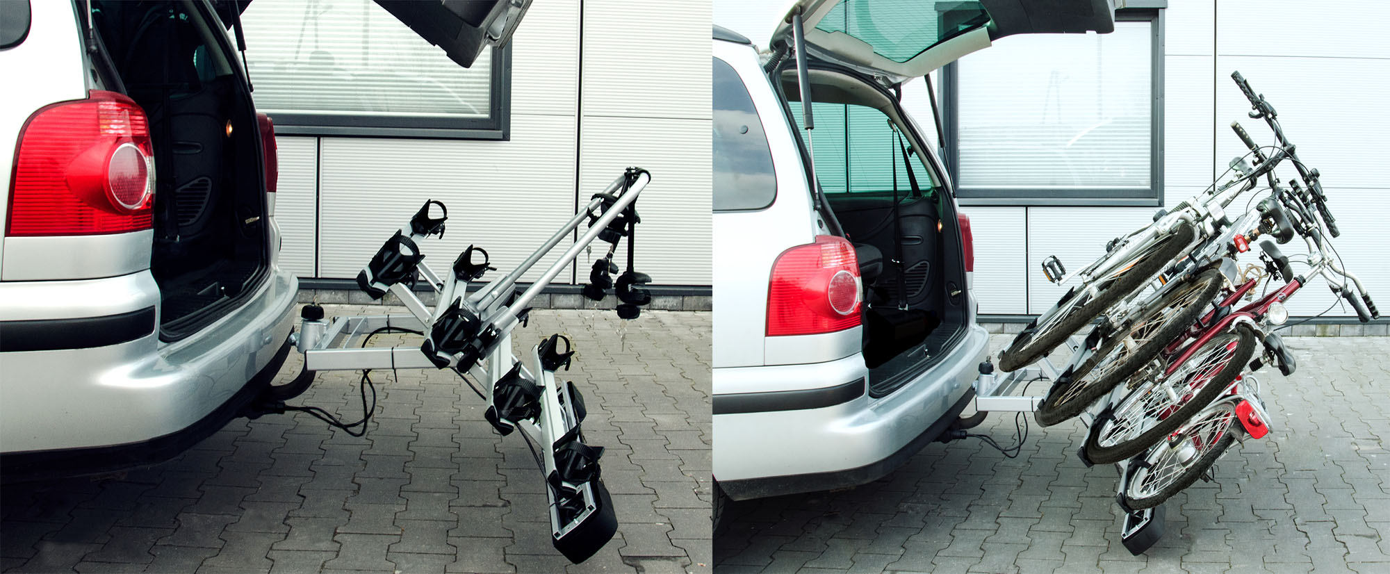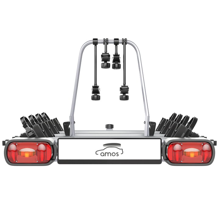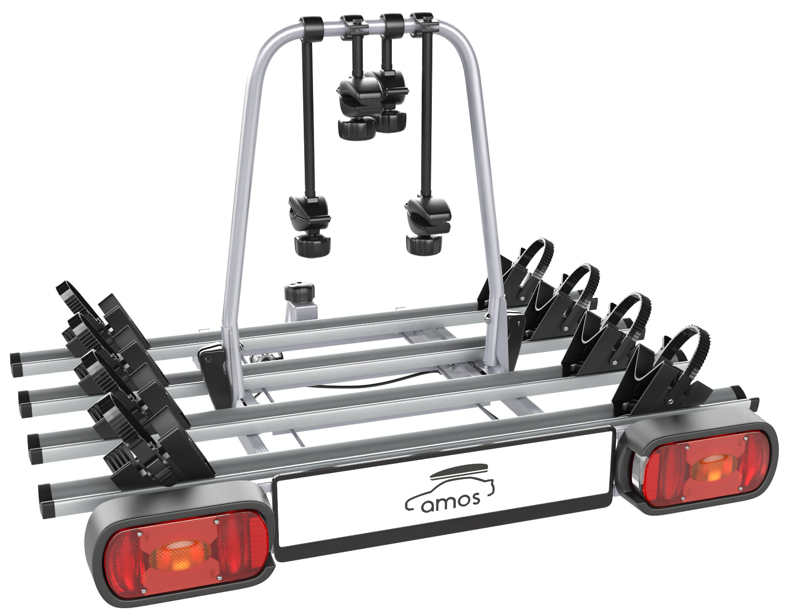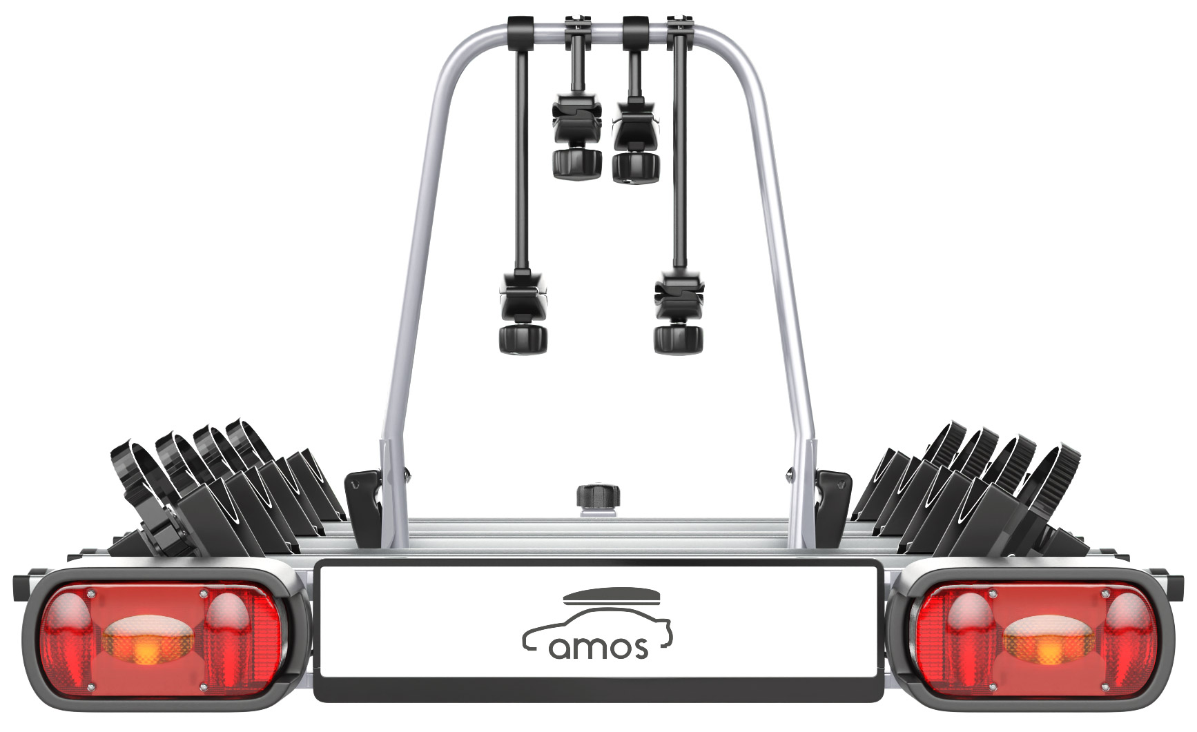 Amos Giro na 4 rowery to bardzo komfortowa konstrukcja (zarówno dla użytkownika jak i dla przewożonych rowerów). Bagażnik mocowany jest do kuli haka i posiada zabezpieczenie przed kradzieżą w postaci zamka na klucz w miejscu montażu. Dodatkowym zabezpieczeniem antykradzieżowym są łapy na kluczyk podłączane do ramy roweru. Giro posiada również wygodną funkcję uchyłu, która zapewnia dostęp do bagażnika samochodu bez konieczności demontażu platformy, a także rowerów. Przed zakupem warto sprawdzić jaki maksymalny nacisk na kulę haka dopuszcza producent haka. W przypadku samochodów z kołem zapasowym z tyłu (SUV) konieczny będzie demontaż koła lub też nie będzie możliwości zainstalowania maksymalnej ilości rowerów. Teraz także z powiększoną ładownością do aż 75 kg!
