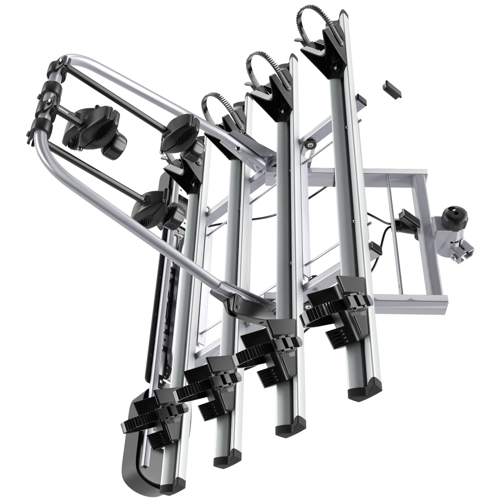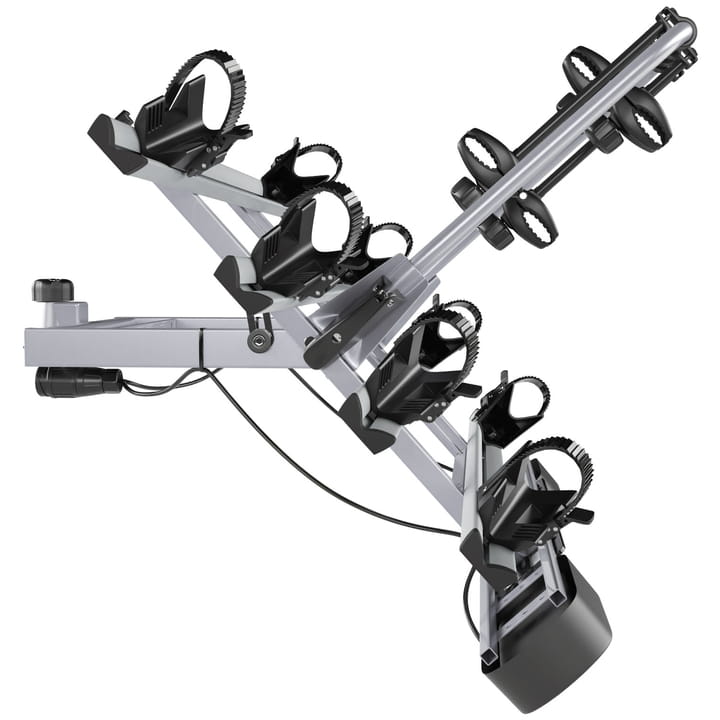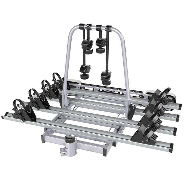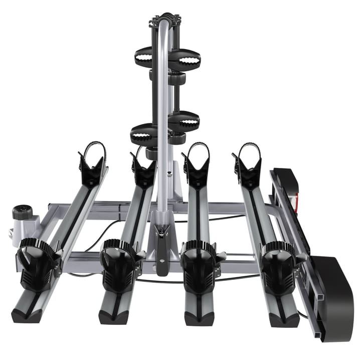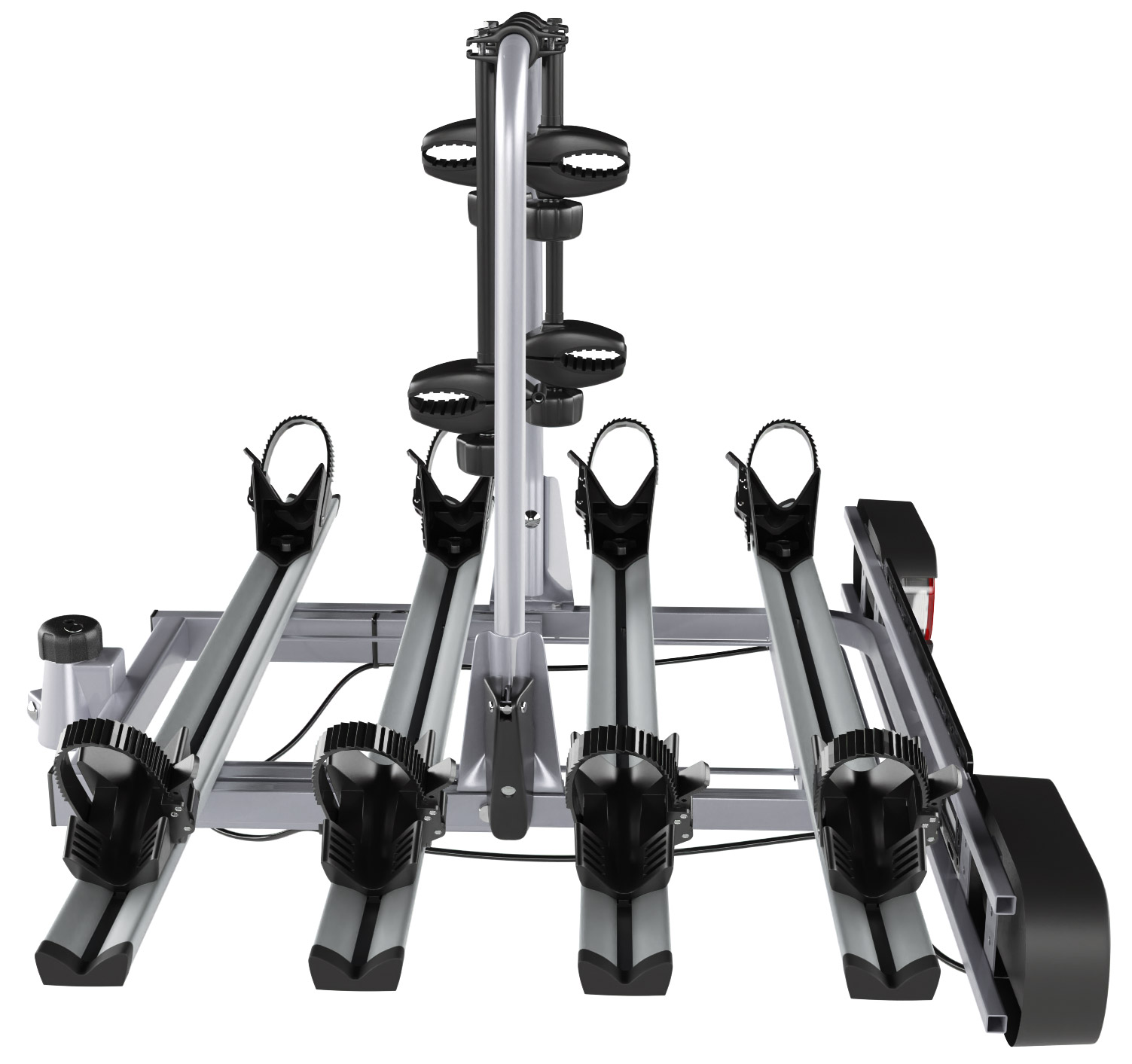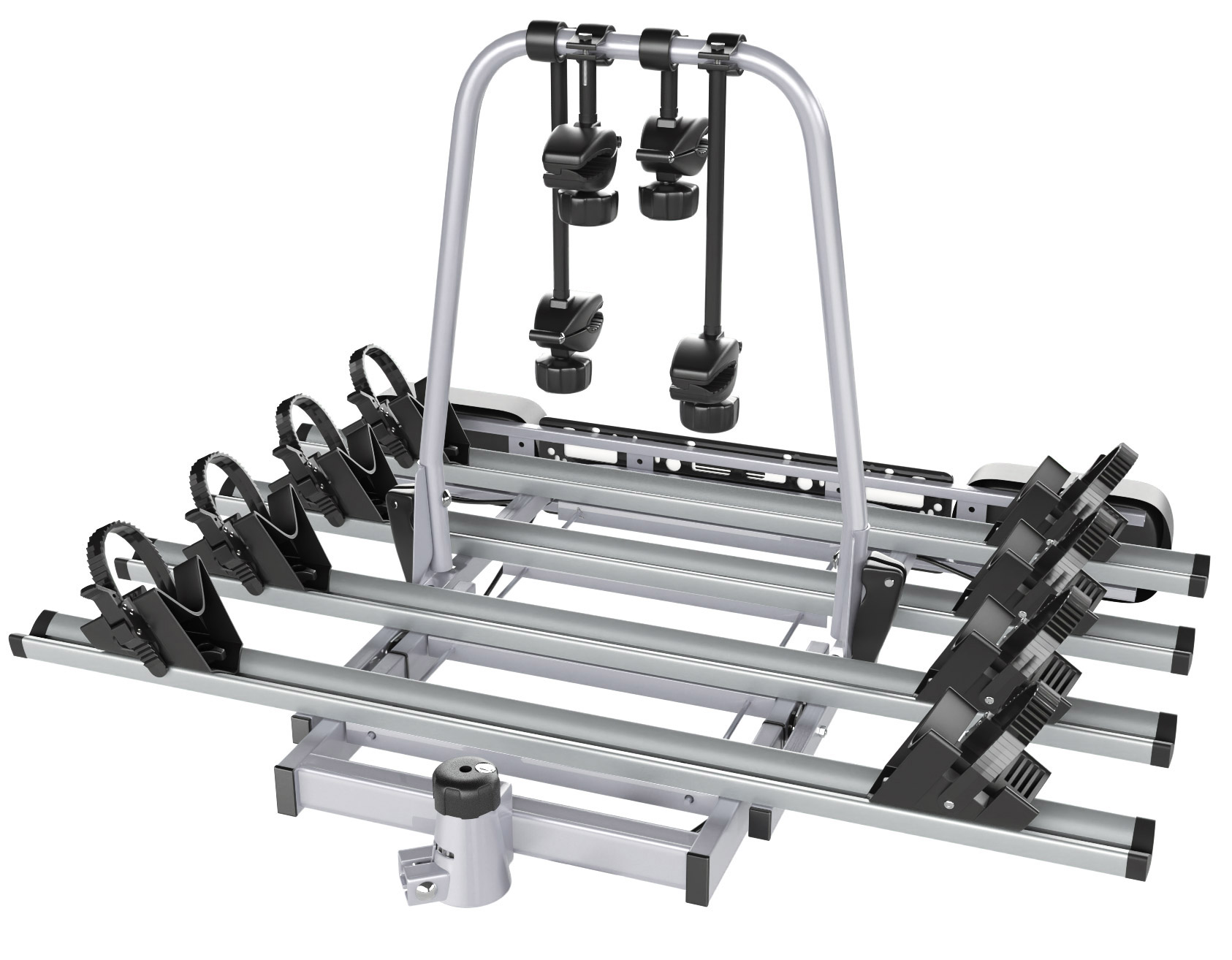 Amos Giro na 4 rowery to bardzo komfortowa konstrukcja (zarówno dla użytkownika jak i dla przewożonych rowerów). Bagażnik mocowany jest do kuli haka i posiada zabezpieczenie przed kradzieżą w postaci zamka na klucz w miejscu montażu. Dodatkowym zabezpieczeniem antykradzieżowym są łapy na kluczyk podłączane do ramy roweru. Giro posiada również wygodną funkcję uchyłu, która zapewnia dostęp do bagażnika samochodu bez konieczności demontażu platformy, a także rowerów. Przed zakupem warto sprawdzić jaki maksymalny nacisk na kulę haka dopuszcza producent haka. W przypadku samochodów z kołem zapasowym z tyłu (SUV) konieczny będzie demontaż koła lub też nie będzie możliwości zainstalowania maksymalnej ilości rowerów. Teraz także z powiększoną ładownością do aż 75 kg!